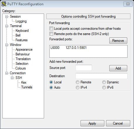 - Extend your Putty configuration with a local forwarded tunnel allowing connections to port 5901 representing X-display 1 (we use localport 6000 in the example)